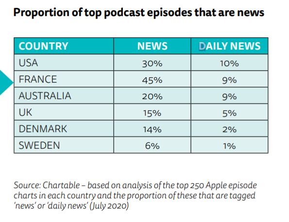 根据路透社新闻研究所在2020年底的报告,苹果播客近130万个节目中,只有7%左右是新闻类播客,但其影响力远超所占比例。其中,每日新闻类播客在全部数量中占不到1%,但在美国最热门前250个播客中占10%,在法国和澳大利亚占9%,表现亮眼。[5]
