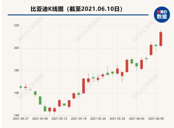6月8日,比亚迪股价大涨6.55%。同日,有消息传出,苹果与宁德时代和比亚迪磋商为其电动汽车项目供应电池的协议。6月10日,比亚迪股价再度大涨6%,收报214.11元。