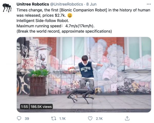 同时完美继承了普通狗子撒手没的速度。根据官方视频演示,这只机器狗的最高速度可达4.7m/s,是目前市面上速度最快的机器狗: