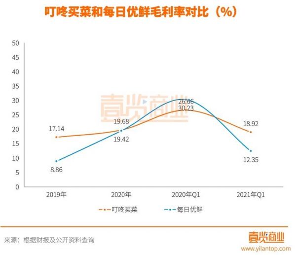 在毛利率方面,招股书数据显示,叮咚买菜的毛利率从2019年的17.1%提高到2020年的19.7%,而每日优鲜的毛利率从2018年的8.6%提升至2020年的19.4%。两家都在不断的提升,叮咚买菜的毛利率一直维持在较高水平,每日优鲜在整体毛利控制水平上略低于叮咚买菜。