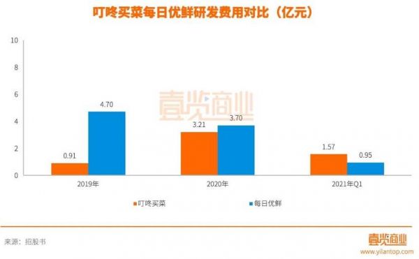 显然,为了盈利二者在运营效率上都下了苦功夫,近三年的运营能力均有所提升。叮咚买菜的履约成本较高的主要原因是在研发费用和员工成本的提升。截至2021年3月31日的三个月内,叮咚买菜员工成本增至1.565亿元人民币,产品开发和IT服务费用相关的员工成本增加主要是因为在研发人才上的投入。