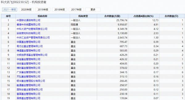 此外,科大讯飞股东中基金扎堆,截至一季度末,基金持股超6374万股,持股比例为3.15%。