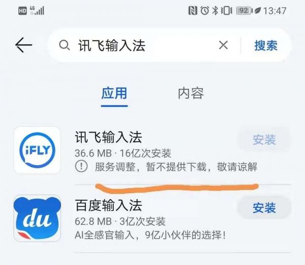 据每经小编测试发现,在苹果、华为、小米等应用商店搜索讯飞输入法,均无结果显示或无法下载。在华为应用商店,讯飞输入法下方提示暂不提供下载,原因是“服务调整”。