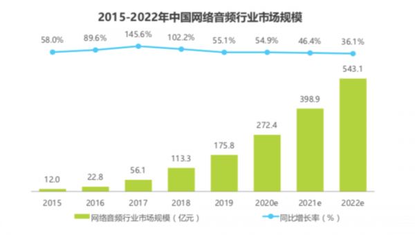 艾瑞咨询《2020年中国网络音频行业研究报告》显示,2019年,中国网络音频行业市场规模为175.8亿元,同比增长55.1%。