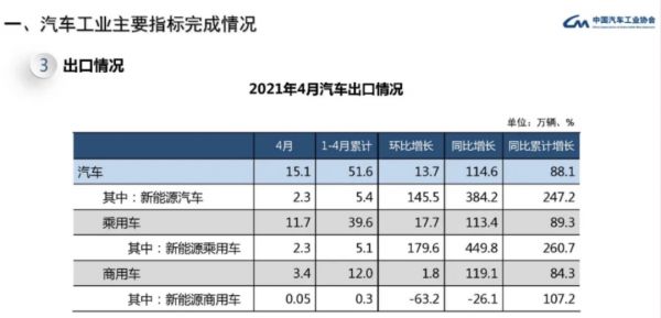 2021年,新能源汽车出口数量仍在提升。据中国汽车工业协会统计,仅4月份,我国新能源汽车出口数量即达到2.3万辆,同比增长384.2%;1-4月份,新能源汽车出口数量同比增长247.2%,达到5.4万辆,已超过了去年上半年数据。