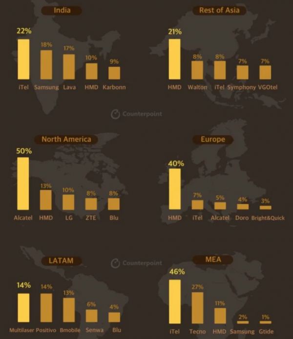 2020年Q3各地区功能机市场份额排行,图源Counterpoint