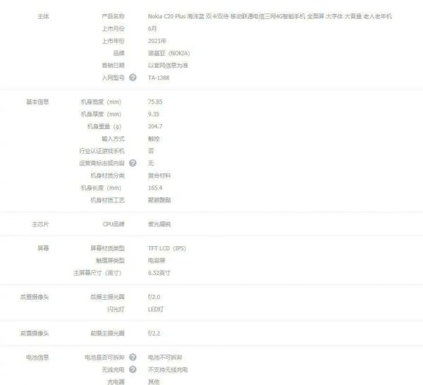 Nokia C20 Plus配置图,图源京东商城