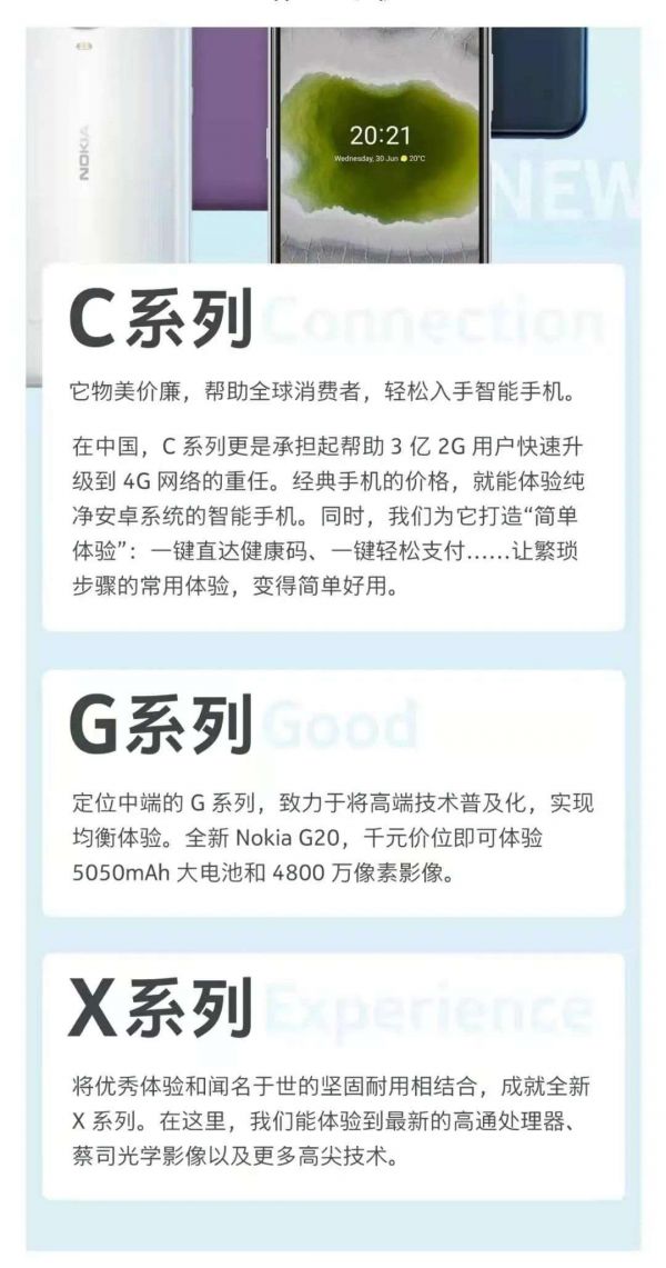 今年4月,诺基亚手机在微博上发布了一组图片,诺基亚表示,将以X、G、C三大系列智能手机重新划分产品系列,每个系列涵盖9款机型。