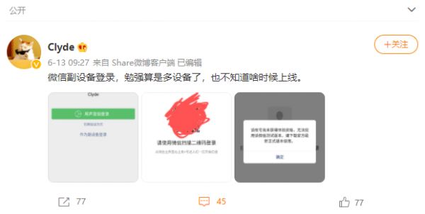 据微博网友反馈,微信内测的新功能为“副设备登录”,潜台词是“登录时主设备上的微信账号不会被强制退出”。我们都知道,微信只能在一台设备上登录,如果在已登录的状态下改用其他手机登录,那么原先设备上的登录账号就会被强制下线,或多或少地给我们带来一些不便。