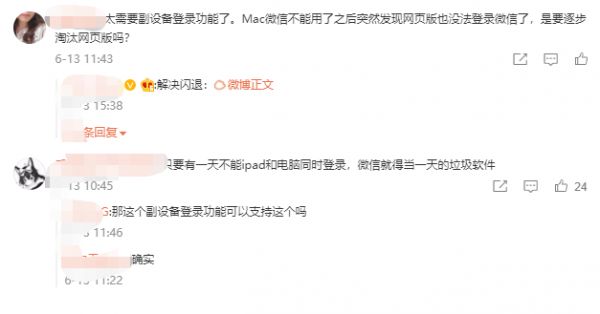 当然,并不是大多数人都会遇到同时使用多款设备的情况,但并不意味着应用多设备没有对应的使用场景。比如在原博主的评论中就有网友提到,由于BUG或者其他原因,iPad微信不能和Mac微信同时登录,这让他们的工作生活受到了较大影响。