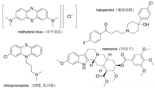 上世纪50年代,人们发现,两个化学合成的新药——在亚甲基蓝染料(methylene blue)的结构基础上合成的氯丙嗪(chlorpromazine,CPZ)和氟哌啶醇(haloperidol),及一个从天然植物中提取的药物利血平(reserpine),可以用来治疗精神疾病(结构见图2)。
