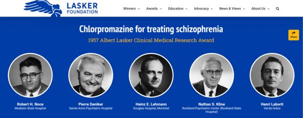 图4. 1957年,拉斯克临床医学奖授予5位医生,表彰他们对氯丙嗪、利血平用于治疗精神分裂等特定精神疾病的研究。