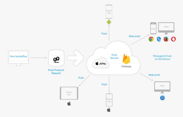 ▲基于 APNs 和 FCM 实现的各种推送 图源:GoodBarber