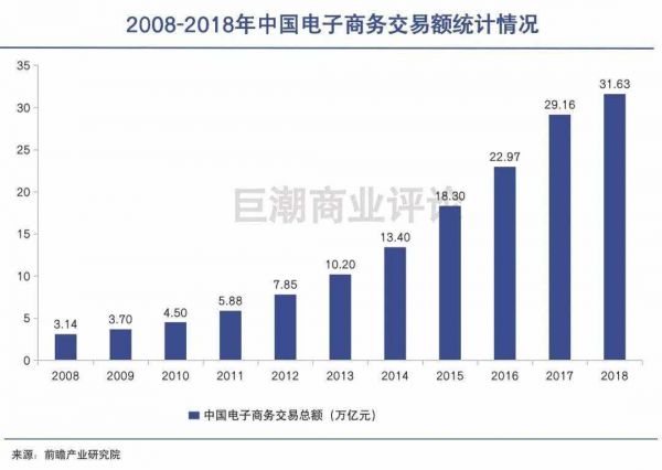 前瞻产业研究院数据显示,2008年中国电子商务交易总额仅仅达3.4万亿元。进入2018年底,中国电子商务交易总额超30万亿元,达到了31.63万亿元,2008-2018年十年十倍增长。