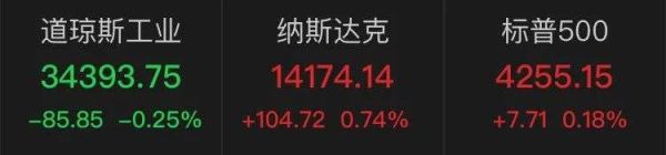 截至收盘,道指跌85.39点,报34394.21点,跌幅为0.25%;纳指涨104.72点,报14174.14点,涨幅为0.74%;标普500指数涨7.76点,报4255.20点,涨幅为0.18%。