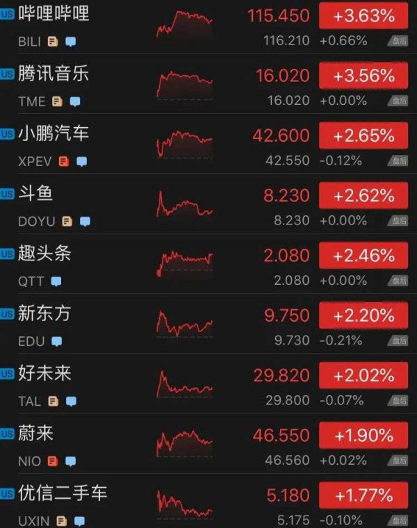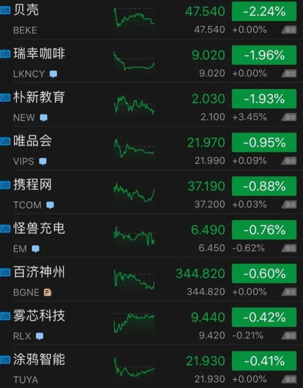 跌幅榜上,贝壳跌2.24%,瑞幸咖啡跌1.96%,腾讯ADR跌0.05%、拼多多跌0.30%。