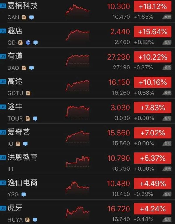 热门中概股大多上涨,中概ETF KWEB和CQQQ分别涨近0.7%和约0.3%。教育股中,网易有道和高途涨逾10%,新东方涨超2%,好未来涨2%,而51talk跌近0.4%。其他个股中,上周五上市的BOSS直聘收涨近8%,嘉楠科技涨18.12%,百度和阿里巴巴涨逾1%。