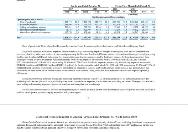 由于叮咚基本采用直接采购的方式,商品到手价已经省去了许多中间环节,因此想要指望该部分成本进一步大幅削减并不现实。况且,作为与销售息息相关的增量成本,销售货物成本与销售收入正相关的变动未尝不是一件好事。