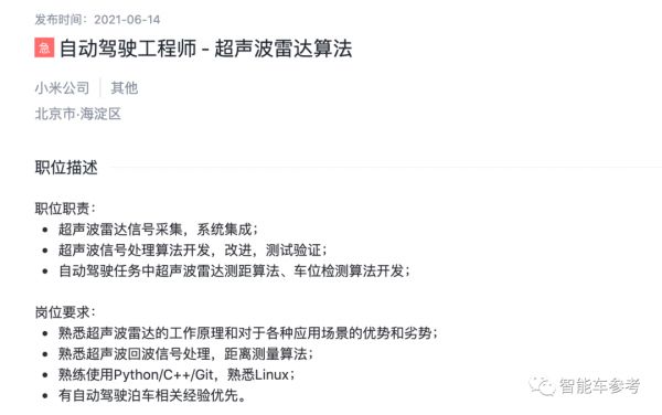 在小米的招聘中,毫米波雷达、超声波雷达等都是其中:
