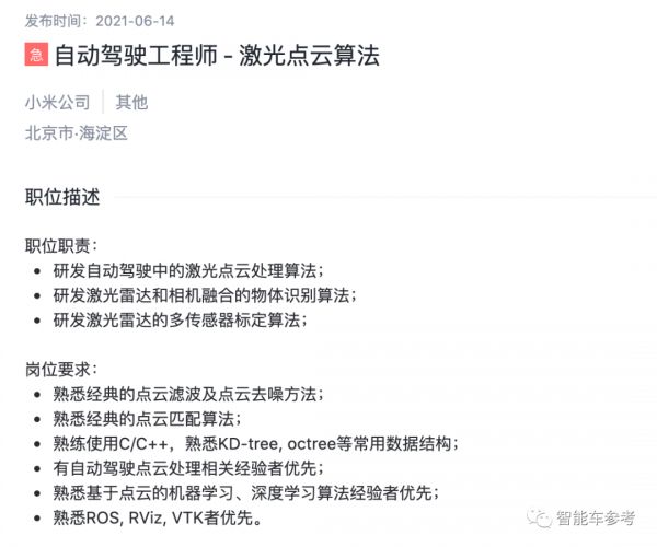 甚至还有激光雷达相关算法人才的需求: