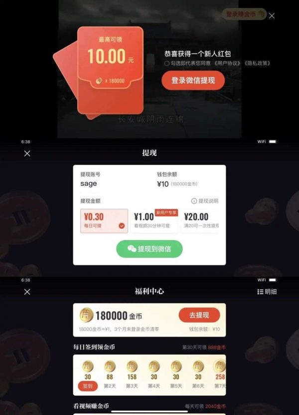 在 app 中,它首先会以最高 10 元的新人红包吸引你登录微信账号,但这 10 元的新人红包并不能完全提现,看视频三十分钟仅能提现 1 元。当然,你也可以攒到 20 元一次性提现,但这并不容易。