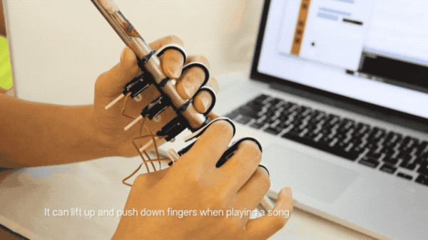 大家来看一下,这是2017年的研究。这个笛子上连了6个指环,指环被马达控制,马达被程序控制。这样它就可以教你吹笛子了。