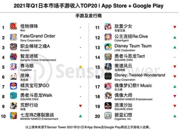 图:2021年q1日本手游市场收入排名,来源:sensor tower