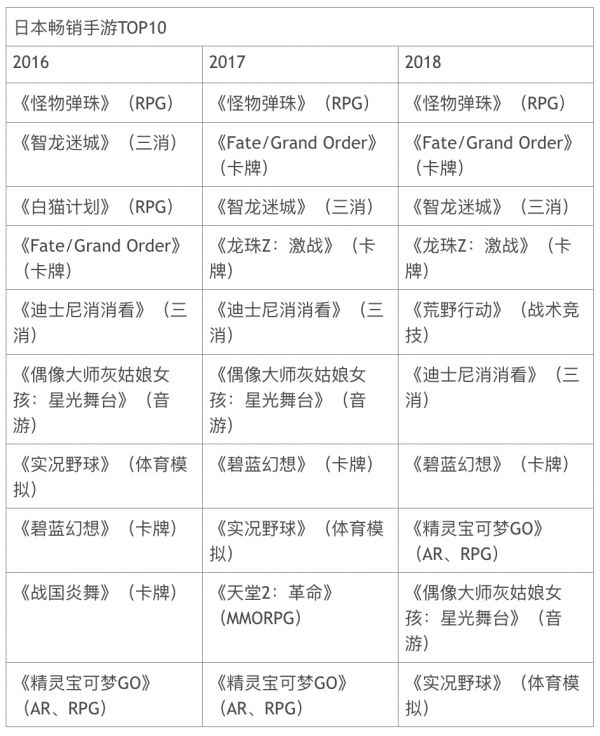 日本长期畅销的手游,又大多集中在RPG、三消、二次元卡牌这几个赛道。