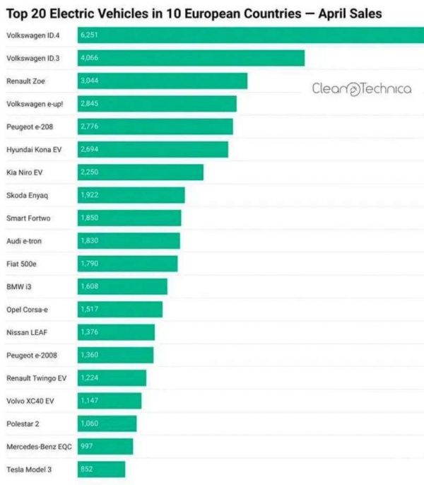 统计网站EV Sales数据显示,今年4月特斯拉在欧洲市场仅交付了1244辆Model 3,这一惨淡的数据致使特斯拉直接跌出了欧洲单一车型销量排行榜Top 20。