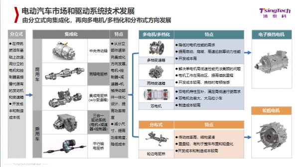 随着新能源汽车的发展,新能源汽车需要有专门为电动汽车研发的电机和控制系统。第一代电驱动技术,是分立式电机和控制系统,能满足基本需求。第二代,是面向新能源车的集成化技术,将电机、减速器和控制器集成,让产品的功率密度更高;第三代技术朝着两个方向发展,一个是多电机/多挡化驱动,一个是分布式驱动。