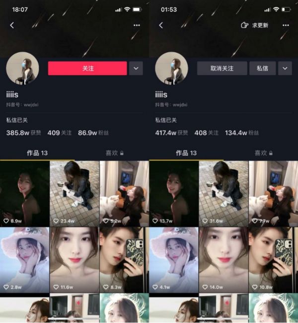 当时iiiis账号的粉丝数为85万,截止次日凌晨一点半,粉丝数为133.5万,半天净增48.5万粉丝。