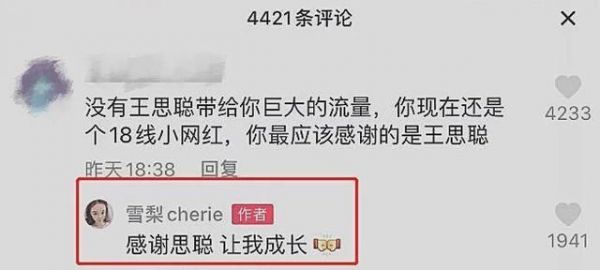 “没有王思聪带给你巨大的流量,你现在还是个18线的小网红,你最应该感谢的是王思聪。”今年年初,雪梨在社交平台上发布了一条视频,有留言在下面这样写道。对此,雪梨倒是挺大度,回复是“感谢思聪 让我成长”。