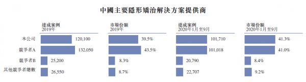 目前市场上基本是隐适美和时代天使二分天下。按2020年的达成案例计算,时代天使于同年的市场份额为约41%,隐适美约高出0.4%,二者市场占有率总计为82.4%。