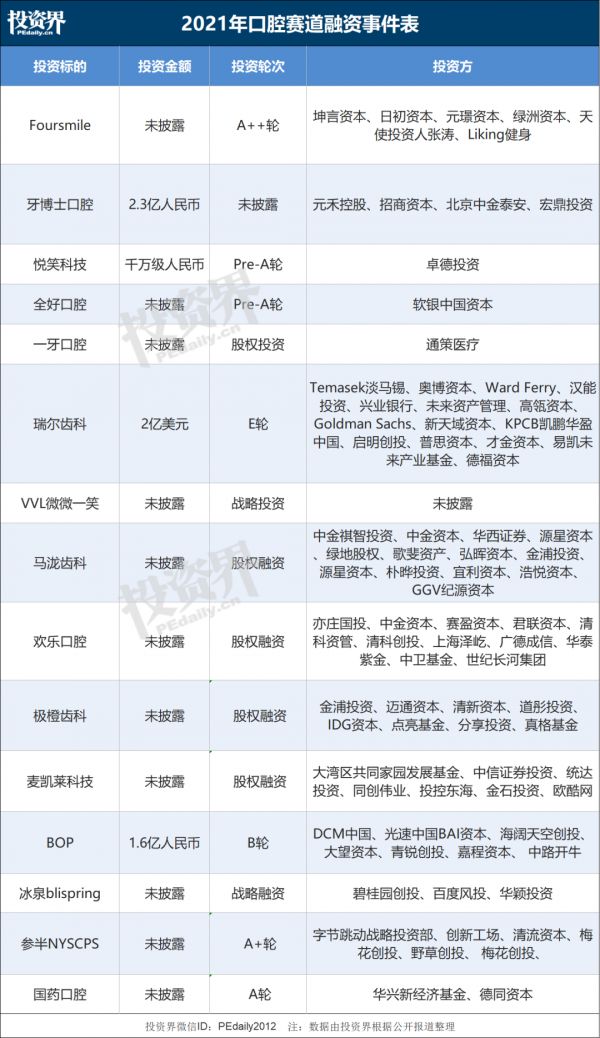 目前,修复、正畸和种植是其中最重要的三类业务,而这三类业务也是VC/PE重点关注的方向。以正畸赛道为例,3月末以来,包括包括Foursmile、牙博士口腔、悦笑科技、全好口腔、一牙口腔、瑞尔齿科、VVL微微一笑、马泷齿科、欢乐口腔等纷纷完成融资。