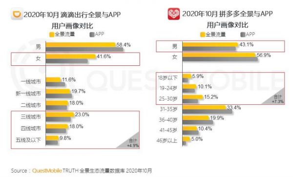 根据QuestMobile于2020年10月发布的研究报告,TOP100的APP中,超过半数已经布局小程序。以滴滴和拼多多为例,全景流量下滴滴出行收获了更多的女性用户及下沉市场用户,拼多多实现了对30岁以下用户的渗透。