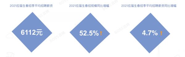 据BOSS直聘研究院6月15日发布的《2021应届生就业趋势报告》显示,2021年应届生岗位平均薪资为6112元,同比增长4.7%,呈小幅增长的趋势。2021年应届生的平均期望薪资为6030元,与去年同期基本持平。