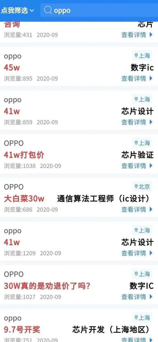有网友称,OPPO是芯片人才跳槽的首选,现在应届生IC设计类,普遍30w起薪,稍微好点的40w,博士基本55w起步,从芯片岗位的市场价来看,40w是属于合理现象。据悉,去年OPPO给应届生开出的年薪,也在40万左右。