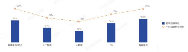 值得注意的是,智能硬件类岗位的需求呈大幅增长趋势,规模同比增长102%,薪资同比增长28%。