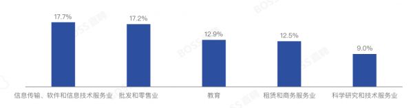 在2021年春招季中,受应届生关注的前五个行业大类集中在现代服务业领域,以数字技术类岗位为主的互联网、电子/通信和科学技术服务行业吸引了26.7%的应届生。