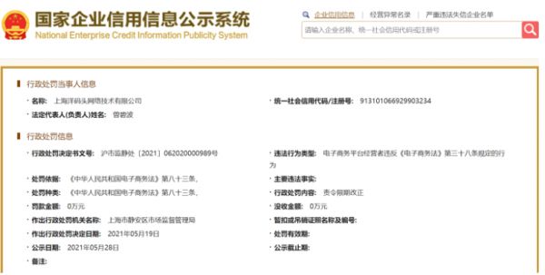 5月28日,国家企业信用信息公示系统披露信息,洋码头因违反《电子商务法》第三十八条规定的行为,被上海市静安区市场监督管理局责令限期改正;紧接着,6月9日,“上海发布”公众号通报75款侵害用户权益行为且未完成整改的APP,洋码头在名单之列。