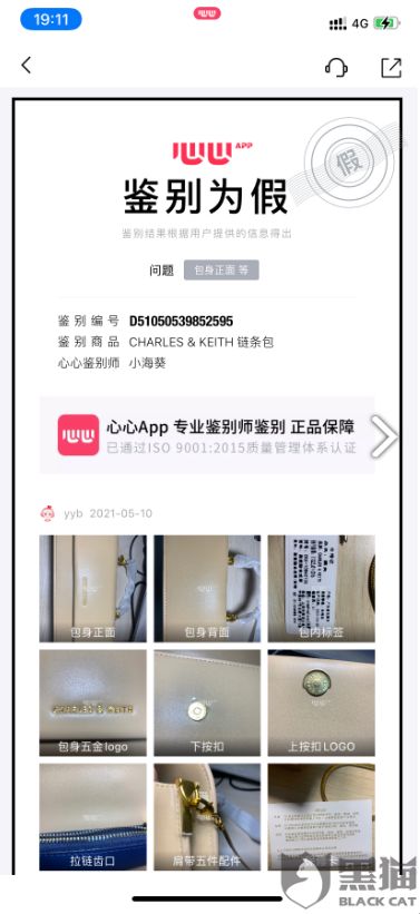 肖晓雨(化名)5月17日在黑猫投诉平台上表示,其第一次在洋码头买东西,看到一家日本海淘店有4万多粉丝,就买了一个小ck的包包。收到货后,货品质量不好,在鉴定平台测为假货后,她跟卖家协商退款。据其描述,第一次店家拒绝了退款申请不让退,第二次才同意。