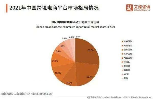 艾媒咨询数据显示,在2021中国跨界电商进口零售市场中,天猫国际和考拉海淘以26.7%和22.4%的市场份额领先,京东国际、苏宁国际及唯品国际等市场份额均在10%以上,而洋码头则排名第六,市场份额仅有5.5%。