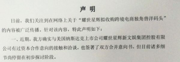 洋码头方面则发布声明表示,其确实与美国纳斯达克上市公司耀世星辉新文娱集团控股有限公司有过资本合作意向的接触和洽谈,也签署了双方合并意向书,但目前诸多细节尚停留在初步探讨阶段。