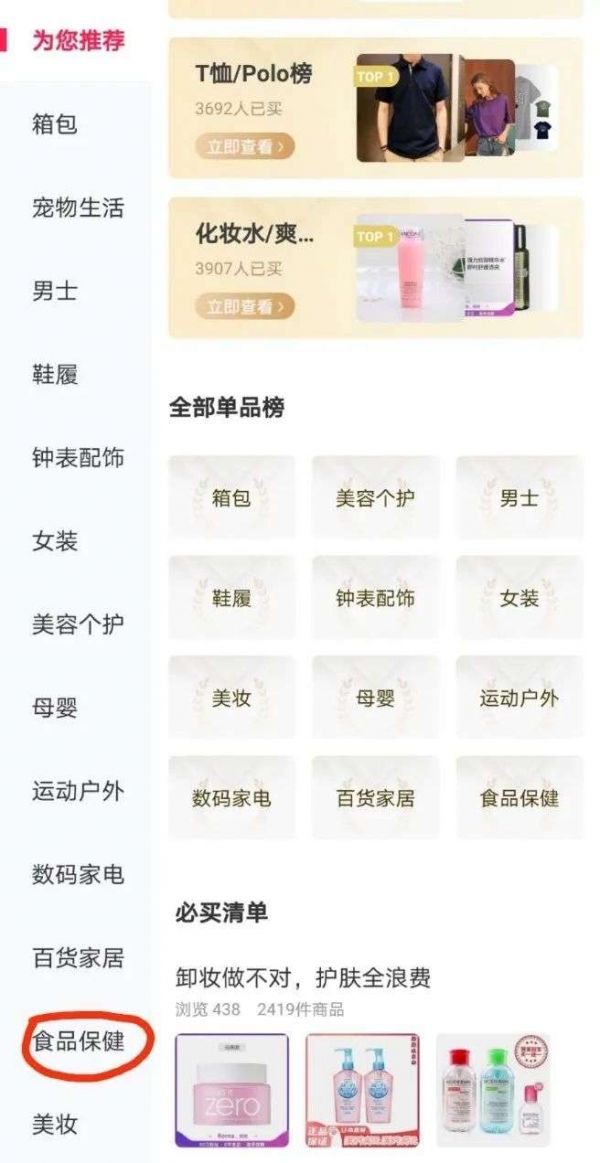 记者查看洋码头App首页发现,服饰鞋履、箱包钟首和美妆个护放在突出位置,而食品保健则在频道页内靠下的位置。