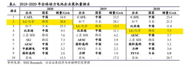 宁德时代和LG化学装机量其实差距并不大。据SNE Research,2020年全球动力电池企业第二的LG化学,装机量达到30.8GWh,与第一宁德时代只有4.8GWh的差距,单看市场份额的话,宁德时代拥有25%,LG化学22.6%,差距只有2.4%。