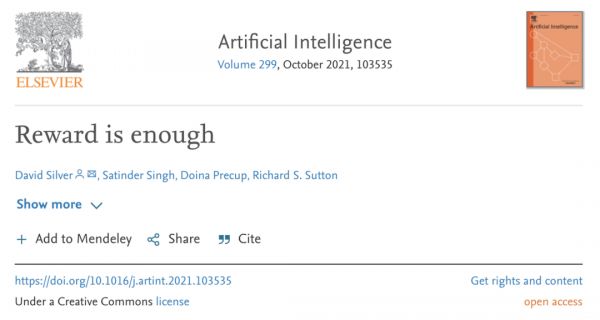 近日,来自 DeepMind 的科学家在提交给同行评议的期刊《人工智能》(Artificial Intelligence)上的一篇题为 “Reward is enough” 的论文中认为,人工智能及其相关能力不是通过制定和解决复杂问题而产生的,而是通过坚持一个简单而强大的原则:奖励最大化。
