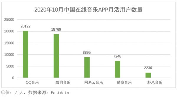 在百度音乐掉队、虾米音乐关停、“两酷”加入腾讯阵营后,中国在线音乐“一超一强”的格局已然显现。Fastdata的《2020年中国在线音乐行业报告》显示,在2020年10月中国在线音乐APP月活用户数量排名中,网易云音乐与酷我音乐处在第二梯队,第一梯队的QQ音乐和酷狗音乐均领先二者一倍以上。
