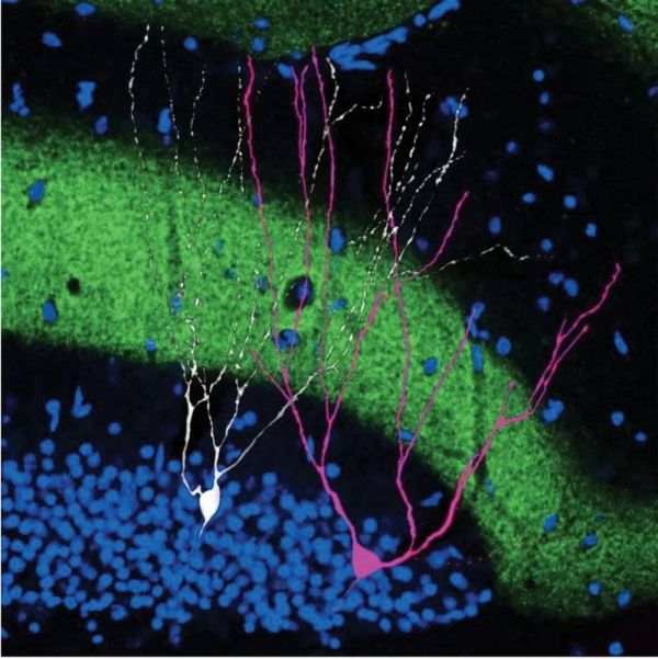 早期阿尔茨海默病小鼠模型的海马齿状回的冠状切片,在光遗传技术的结合下,情境性恐惧记忆下的记忆印迹细胞(绿色)被光敏蛋白ChR2标记。图片来源:Dheeraj Roy