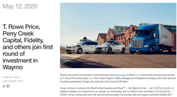 而在两个月后,也就是5月13日,Waymo又宣布完成了7.5亿美元(约合48亿人民币)的融资,主要由T. Rowe Price、Perry Creek Capital、Fidelity等投资机构投资。