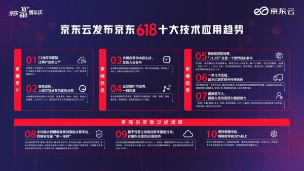 日前,京东集团副总裁、IEEE & IAPR Fellow梅涛博士在“解码京东618:京东云发布十大技术应用趋势”沙龙上首次系统性地发布了京东云618十大技术应用趋势: